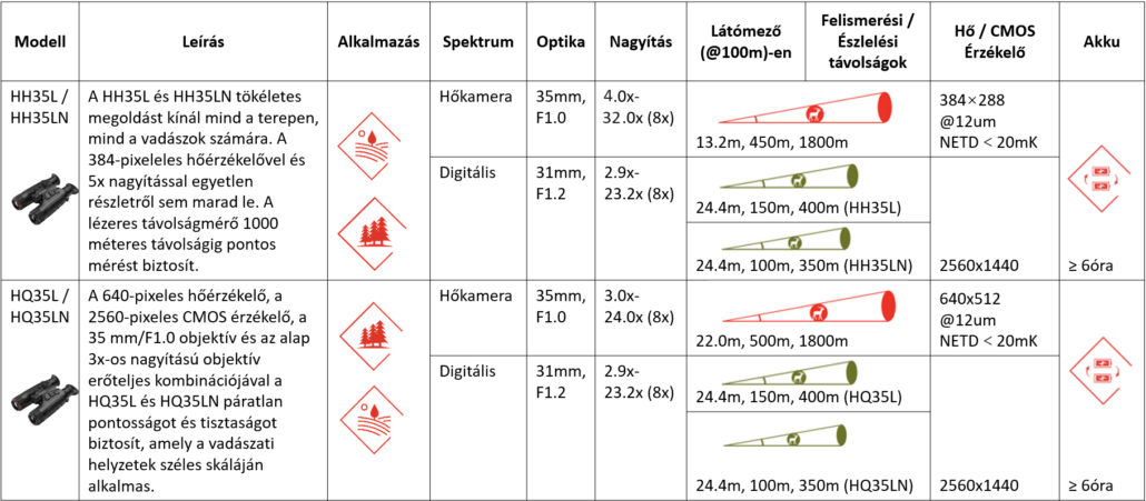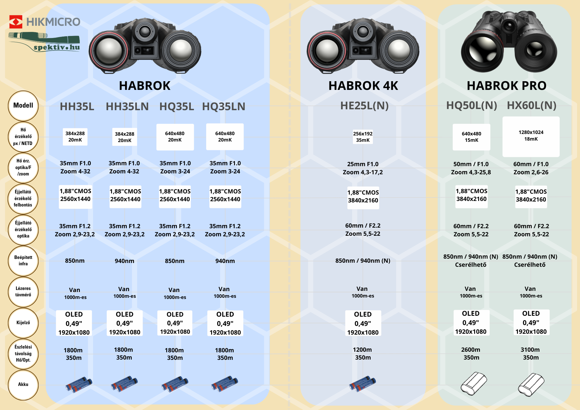 A Hikmicro Habrok sorozatú kézi, kétszemes betekintésű, bispektrális hőkamerák közepes és nagyfelbontású verziójú hőkamerával ultra érzékeny éjszakai / nappali használatra alkalmas optikai kamerával, beépített 1000m hatótávolságú lézeres távmérővel, és beépített infravetővel valamint FullHD 1920×1080 képpont felbontású,OLED kijelzővel rendelkeznek. A Habrok HH35L típusa közepes felbontású 384×288 pixeles rendkívül nagy hőérzékenységű (NETD<20mK) érzékelőelem mellett, 2560 x 1440 pixel képfelbontású ultra érzékeny (0,001 Lux) éjszakai/nappali használatra alkalmas optikai kamerát és lézeres távmérőt is tartalmaz. A hőkamera 35mm-es optikájú kiemelkedő F1.0 apertúrával rendelkezik, amely 4x-es optikai alapnagyítást eredményez. Látószöge 7,5°-os 100 méteres távolságban 13,2m széles látómezőt ad. A Digitális éjjellátó kamera 31mm-es F 1,2 optikával rendelkezik, alapnagyítása 2,9x-es.